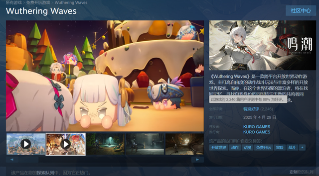 与此同时,《鸣潮》还在今天正式登陆了Steam平台,在超2200条评价中取得了88%好评率,跃居人气蹿升的新品首位。Steam版支持与PS5、PC及移动端跨平台互通,相同服务器的角色进度可无缝继承。不过由于锁国区限制,已注册国服账号的玩家无法通过Steam同步数据。